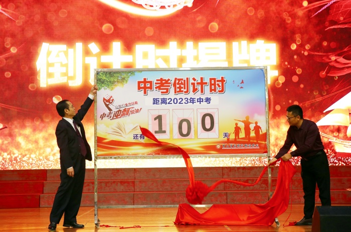 “條形圖,扇形圖,大展宏圖;自變量,因變量,前途無量……”、“Do your best. 盡你所能,全力以赴。You can make it! 你一定可以的!”、“我是電源 我是燈泡 我是電流表 我是導線,我是開關,我們串在一起,用我們的鎂(美)偷走你們的鋅(心), 讓我們一起點亮未來 ,2023 中考加油!”為鼓舞士氣,九年級老師以科組為單位,發揮學科特點,先后上臺為學生加油助威。謝柏祥、李文鄭重揭開“中考一百天倒計時牌”,并與初中部全體教師也一同上臺宣誓,為同學們搖旗吶喊、保駕護航。老師和同學們在寫有“聞雞起舞奮戰百日志金榜題名,破釜沉舟拼搏三月誓蟾宮折桂”的加油橫幅上鄭重簽名,拍照留念,為2023年中考助力。
