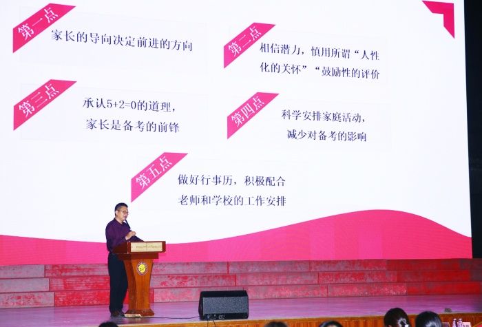 初中部校長李文以“百日之戰協作才能共贏”為題講話。他指出,家長的導向能夠決定學生前進的方向,家長要相信孩子的潛能,成為中考備考的“前鋒”,在學生時間管理、周末時間安排上,切實做到以學生學習為中心,安排好中考前的家庭行事例,多關心、陪伴、鼓勵孩子,積極配合好學校和老師的各項工作安排,真正做到家校共育,打贏中考攻堅戰。