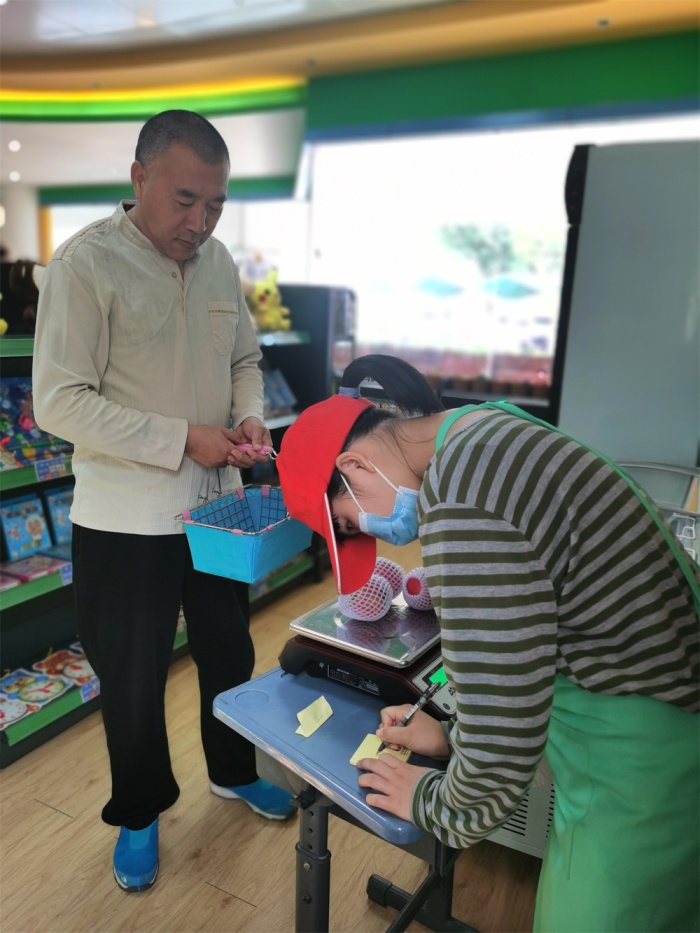 3月15日上午,由培高年級學生組成的博愛超市服務團隊在一系列緊鑼密鼓的前期準備后,正式開始了本學期的超市營業。有了上學期的工作經驗,學生們已經可以熟練地分工合作、按照流程接待客人。超市內的商品有部分調整,上架了更為營養健康的零食、水果和奶制品,除此以外本學期還新增了一個“打稱員”的崗位,專門負責為超市新進的時令水果進行稱重、打價格。這非常考驗學生們對電子秤的使用能力,不過這點事難不倒有著竹苑市場賣菜經驗的培高學生們。只見新上任的“打稱員”熟練地將顧客遞過來的蘋果穩穩地放在電子秤上,麻利地按價格鍵,然后再把金額抄寫下來,和蘋果一起裝進袋子里,交給顧客,一套動作流暢自如、老練成熟。