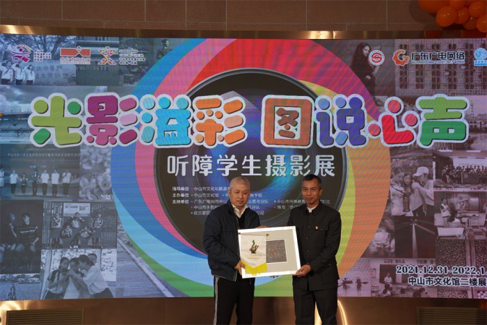 頒牌儀式上,中山市文化館為支持單位廣東廣電網絡中山市分公司授予感謝匾牌,歐派家居集團股份有限公司中山分公司為市特校捐贈課桌椅一批。隨后,引領聽障孩子入門的珠海“快門無聲”公益項目創始人朱習女士對孩子們的成長表示驚喜和欣慰,“光影溢彩 圖說心聲”聽障學生攝影培訓項目負責人、本次攝影展主要策展人之一賀億強先生表達了自己的感謝與激動,并對聽障孩子今后攝影學習作了詳細規劃。活動中,嘉賓與學生代表共同為本次開幕式剪彩,接著嘉賓們一同步入展區,靜心賞鑒聽障孩子們用眼睛“聽到”的世界,用鏡頭記錄的生活,為明媚綻放的生命之光點贊!