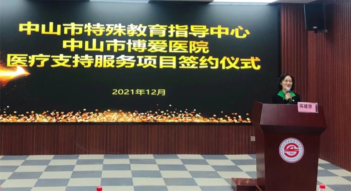 12月10日上午,中山市特殊教育指導中心購買中山市博愛醫院醫療支持服務簽約儀式在特校一樓階梯室舉行。中山市博愛醫院黨委副書記、院長高建慧女士,中山市特殊教育指導中心主任、中山市特殊教育學校黨總支書記、校長湯劍文先生,中山市博愛醫院黨委委員肖文先生,團委副書記鮑文博先生,醫務部科長賴春華女士,財務科副科長孫靜女士出席活動。市特殊教育指導中心的老師、巡回指導教師、家長代表、媒體記者等參與活動。