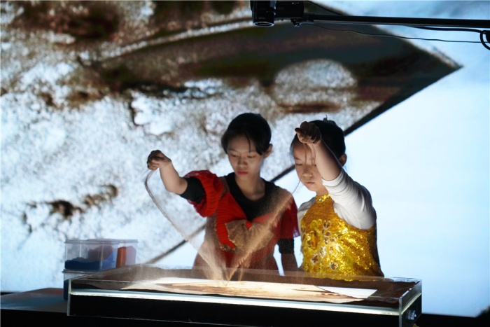 緊接著,中山沙畫先行者、中山沙之夢(mèng)工作室創(chuàng)始人孟祥娟老師現(xiàn)場(chǎng)表演了沙畫節(jié)目《國(guó)家》。在行云流水的一揮、一撒間,孟老師將一幅幅栩栩如生的畫卷呈現(xiàn)在觀眾眼前。沙畫講述了貧窮落后的舊中國(guó)在中國(guó)共產(chǎn)黨的領(lǐng)導(dǎo)下,逐漸走向繁榮昌盛的宏偉圖景。孟老師出色的造型能力和嫻熟的表現(xiàn)技巧,令現(xiàn)場(chǎng)觀眾目不暇接、贊嘆不已。教學(xué)中,孟老師一直致力于探索研究沙畫獨(dú)特技法——“雙手寫字”,通過讓學(xué)生雙手同時(shí)書寫漢字,促進(jìn)學(xué)生智能的開發(fā)。本次活動(dòng)中山特校聽力部學(xué)生蔡瑞情、鐘展彬、唐常容也走上舞臺(tái)一展風(fēng)采,帶來了雙手寫字展示和沙畫表演《沙之夢(mèng)》,呈現(xiàn)了沙畫教育結(jié)出的喜人碩果。