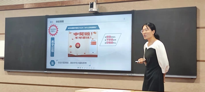 朱麗慶老師憑借扎實(shí)的專業(yè)技能完成上機(jī)實(shí)操。在說課和答辯環(huán)節(jié),以《雙色球大揭密——有趣的Mind+編程應(yīng)用》為主題展開,巧妙地將生活中常見的中獎游戲融入到教學(xué)中,將學(xué)科教學(xué)與德育有機(jī)結(jié)合,幫助學(xué)生樹立正確的人生觀和價(jià)值觀,破解彩票中獎的秘密,提醒學(xué)生不要投機(jī)取巧,避免有不勞而獲的思想,應(yīng)該通過自己的努力實(shí)現(xiàn)夢想。朱老師的選題立意新穎,述評深刻,給現(xiàn)場評委留下了深刻印象。