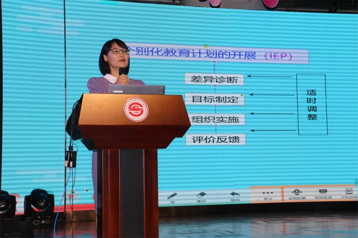 朱建美老師分享了她在IEP工作中的實踐心得。她指出,思想上的轉(zhuǎn)變很重要,要從優(yōu)勢視角出發(fā),而非問題視角,更多關(guān)注學(xué)生的優(yōu)勢和潛能。她從差異診斷、目標(biāo)制訂、組織實施、評價反饋等四個方面進行詳細闡述,并提出了推行導(dǎo)生制、同伴協(xié)助、落實差異教學(xué)等策略,分享了自己在生活適應(yīng)和勞動技能課上運用園藝療法進行的新探索。內(nèi)容充實有質(zhì)量,老師們獲益匪淺。