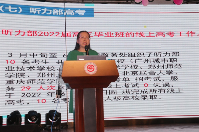 陳云華副校長從校級各項評比、信息技術(shù)2.0、聽力部高考等八個方面回顧了上學(xué)期的主要教學(xué)工作。她表示,在剛剛過去的一個學(xué)期,中山特校全體教師腳踏實地、銳意進取,譜寫了踔厲奮發(fā)的輝煌篇章。她闡述了學(xué)校IEP工作的發(fā)展歷程,點出目前IEP工作存在的問題和需進一步改進的方向。另外,下一步學(xué)校將繼續(xù)夯實教研科研活動,注重研訓(xùn)結(jié)合;完善和規(guī)范教育體系,大力發(fā)展職業(yè)教育;優(yōu)化協(xié)同教學(xué)模式,提升課堂教學(xué)質(zhì)量。她希望老師們從“心”開始,從“細”著手,探索更多行之有效的教學(xué)方法,以嶄新的工作面貌和務(wù)實的工作態(tài)度,為中山特殊教育事業(yè)揮灑青春和汗水,貢獻智慧和力量。