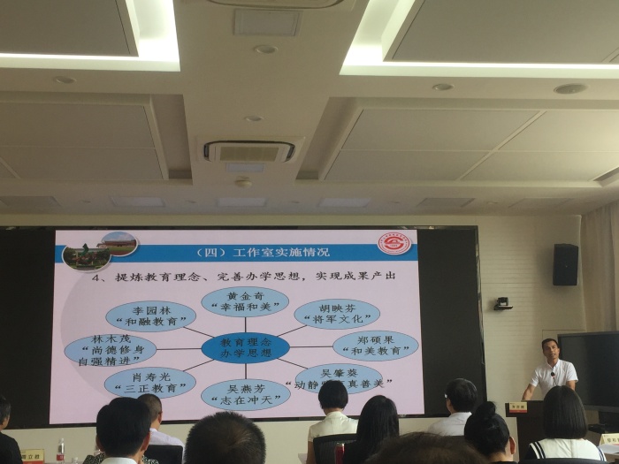 該工作室成立于2016年3月,在市名校長工作室管理辦公室指導(dǎo)下,以及主持人湯劍文校長和一眾學(xué)員共同推動(dòng)下,成效顯著。工作室以“互相學(xué)習(xí)、資源共享、共同提高、創(chuàng)新發(fā)展”為建室原則,以校長辦學(xué)能力建設(shè)為核心,以提升校長辦學(xué)思想為重點(diǎn),開展活動(dòng)堅(jiān)持“五個(gè)一”:一書(理論專著)、一論(主題論壇)、一題(課題研究)、一看(觀摩學(xué)習(xí))、一診(現(xiàn)場診斷)、一助(對(duì)口幫扶),在具體實(shí)踐中,落實(shí)“三研”、“三實(shí)”的工作策略,使工作室成為名校長的“孵化器”、優(yōu)質(zhì)學(xué)校的“策源地”、經(jīng)驗(yàn)、成果的“輻射源”,將成員校長培養(yǎng)成為新時(shí)代有能力、有思想、有擔(dān)當(dāng)?shù)慕逃母镎摺?shí)踐家,錘煉高素質(zhì)的校長隊(duì)伍。湯劍文校長充分發(fā)揮名校長的輻射作用,把科學(xué)的辦學(xué)理念和先進(jìn)的管理經(jīng)驗(yàn),以學(xué)術(shù)講座、專題研討、發(fā)展論壇等形式在學(xué)員所在學(xué)校進(jìn)行推廣,帶動(dòng)發(fā)展。進(jìn)行辦學(xué)思想凝練的專題輔導(dǎo),在中山市名校長成果展示會(huì)上分享辦學(xué)思想成果,帶領(lǐng)學(xué)員將各自的辦學(xué)思想和教育理念付諸文稿,2019年4月,編著出版的《校長論教:做有思想的教育者》由廣東人民出版社出版。