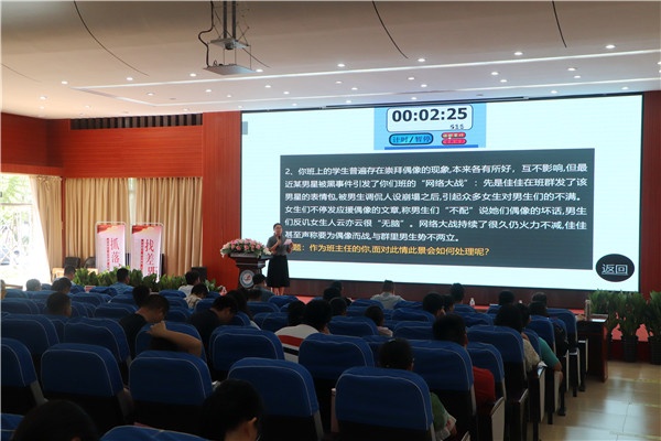 在對本次比賽的獲獎選手頒獎之后,劉基主任做學期班主任工作總結,表揚了疫情之下各位班主任的師德師風,對學校工作的支持與配合,對在班主任能力大賽、心理教育活動月、奮斗杯排球賽、萬名教師訪萬家等四大項活動中教師、學生的參與度之高、成效之突出提出肯定,并對今后班主任工作做出了要求:再接再厲,專業成長,做幸福的班主任。