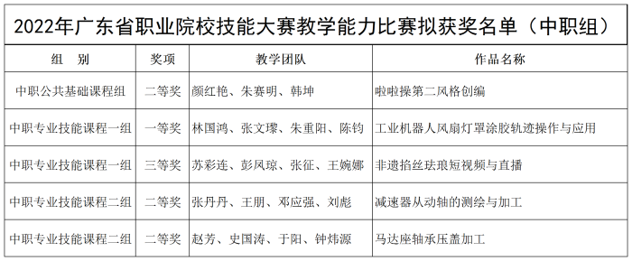 近日,2022年廣東省職業院校技能大賽教學能力比賽獲獎名單正式出爐,學校組成的教學團隊取得佳績,斬獲一等獎1項、二等獎3項,三等獎1項。
