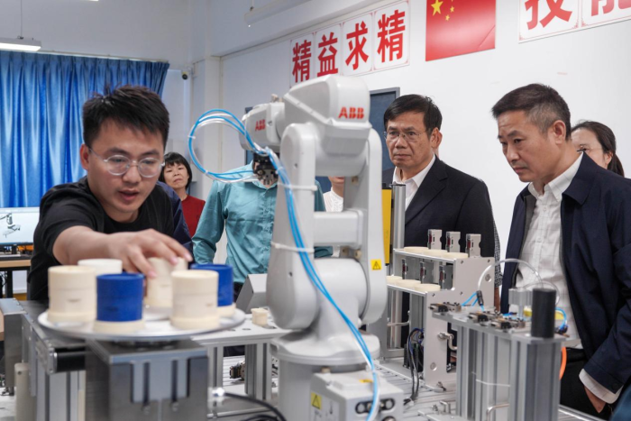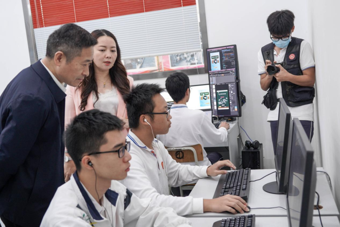 姜術俊副局長一行在中山中專黨委班子的陪同下,實地考察了中山中專校園,對學校基礎設施、專業實訓基地、安全防護方面重點詢問和給予指導。調研隊伍先后來到VR體驗中心、多軸數控實訓中心、工業機器人實訓室等處考察,每到一處,姜術俊副局長都詳細地詢問項目建設和學生實訓情況,校黨委班子一一做了匯報。在調研過程中,姜術俊副局長一行深入了解學校人才培養、專業建設、安全生產、財務基建等工作。