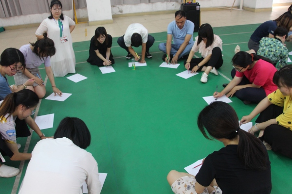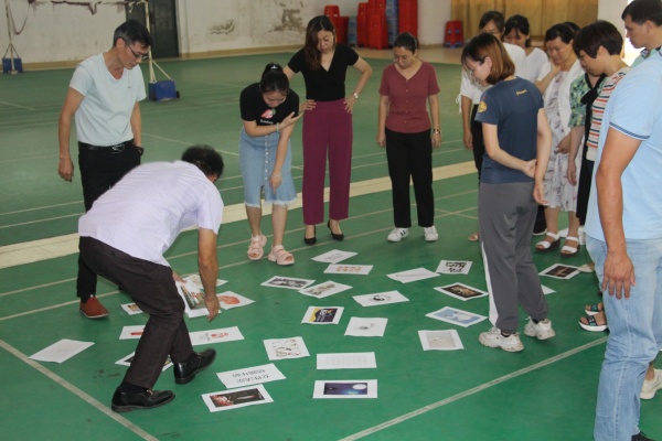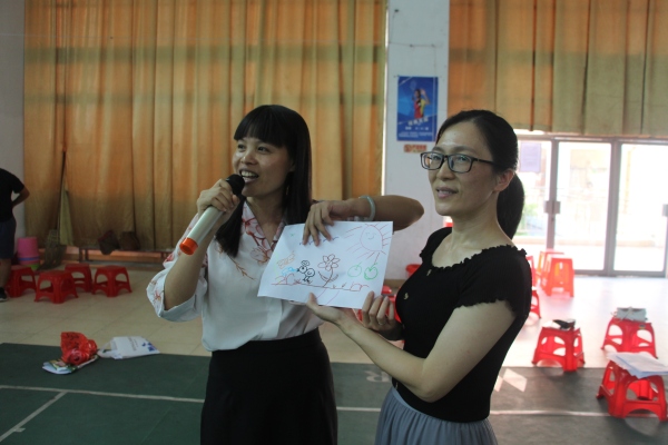 活動特聘請了中山市中小學心理健康教育講師團講師、沙欄中學心理健康專職教師溫倩藝為學校全體教師進行“教師壓力與情緒管理”的團康活動。首先溫老師將老師們分為5個組,每一組選出兩個隊長,由隊長帶領大家完成接下來的活動。活動分為三個部分,第一個活動叫‘看圖猜數字’。每一隊成員需要團結合作,快速的猜出每一幅圖片所代表的數字,之后由隊長快速的送達到老師手中,又快又準的組獲勝。第二個活動是‘用畫減壓’,每一位隊員首先畫出一個點,用點的大小來表示自己的壓力,接下來互相傳給下一位隊員,用畫來畫出正能量,將壓力消除。大家有說有笑的畫著,無形中減輕了大家的心理壓力。最后,老師進行了總結,對大家的積極參與表示了肯定,也希望大家能夠多愛自己,鼓勵教師自主調節自己的情緒建立積極的生活觀和工作觀。
