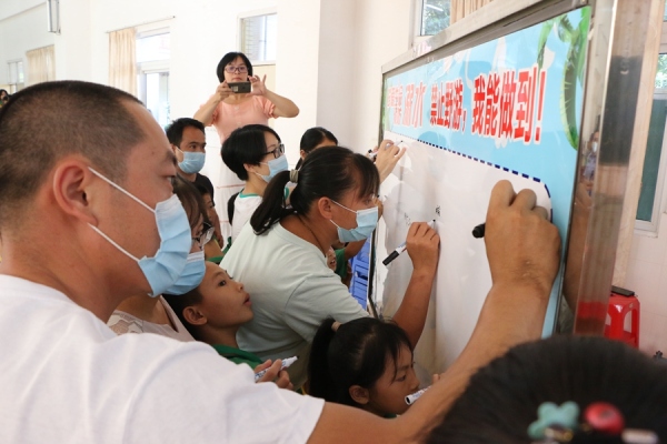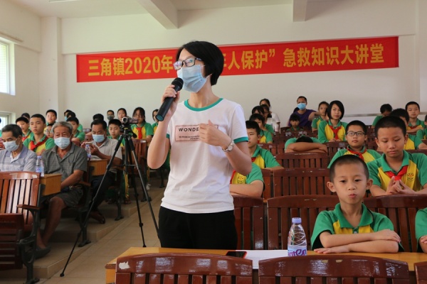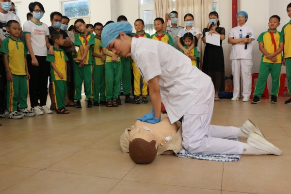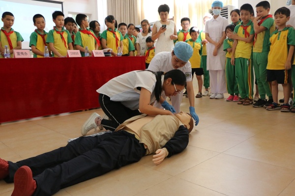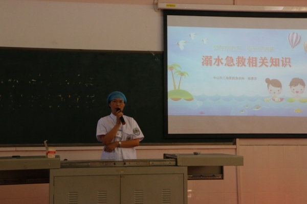 活動中還邀請了三角醫院急診護士長楊惠芬,護士梁曉玲為大家現場講解急救小知識及演示溺水后的應急救援,家長和同學們也積極參與,一起學習發生事故時如何自救或者救助他人,活動現場氣氛熱烈。活動最后,全體同學和家長還齊聲朗讀《防溺水安全知識》,并且在承諾墻上紛紛簽名承諾。