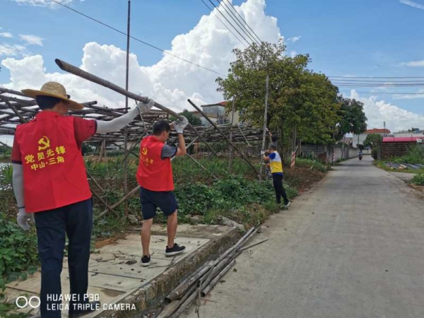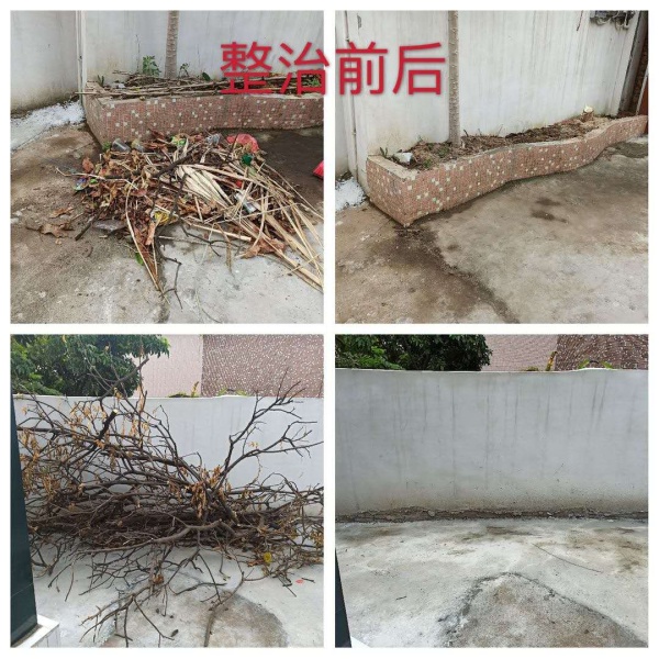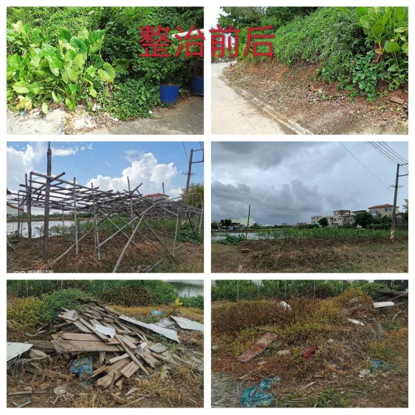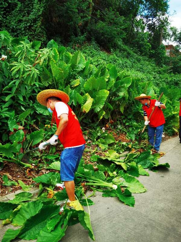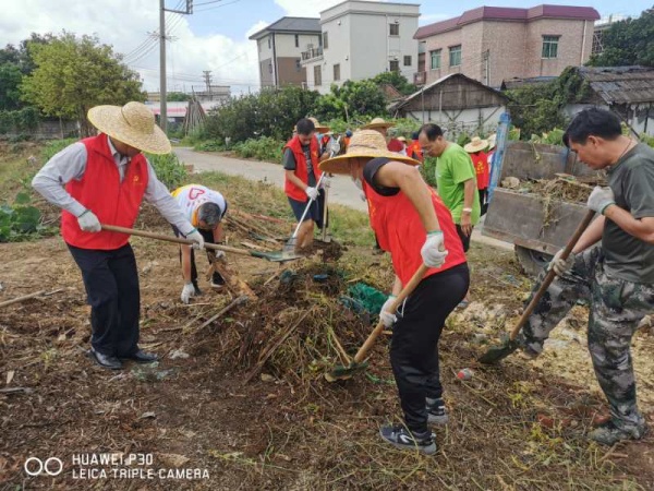 當天早上時而烏云密布,時而晴天,時而下起小雨,仿佛為“戰斗”增添了氣氛。8:30分,同志們整裝待發,草帽、手套、手襪、口罩等保護物品齊上陣;掃把、鐵鏟、鋤頭、鐵耙、砍刀等勞動工具火速到位。9:00隨著領導一聲令下,大伙兵分兩路從東南村府出發,奔赴火熱的“勞動基地”。其中一支隊伍負責清拆亂建棚舍,另一支隊伍清理村民房前屋后積存的垃圾雜物。