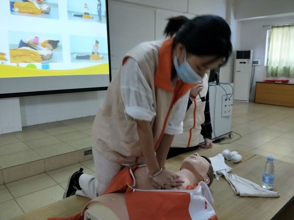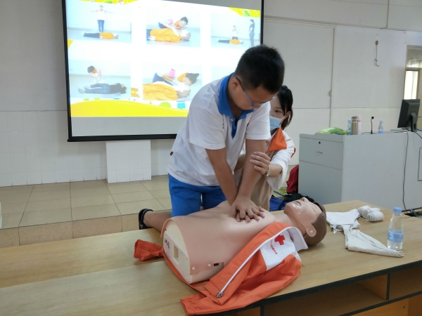 培訓老師先用生動有趣的語言,真實的案例,給師生們做了理論知識的講解。老師講解了生活安全、消防安全、地震防范、中暑急救、溺水救援等內容,并講解了心肺復蘇、人工呼吸等常見急癥、意外傷害的救護原理及技術手段,同時介紹了急救的原則、目的、程序、自我保護等諸多方面的理論知識。接著模擬現場的方式圍繞防溺水事件、日常生活突發事件向學生介紹了緊急救護技巧、呼救和撥打報警電話技巧和遇到突發情況時自救和互救的方法。最后現場示范了心肺復蘇基本技能等應急救助技巧,并邀請了部分同學演示防范方法和急救技能。整個培訓過程氣氛活躍,掌聲不斷。