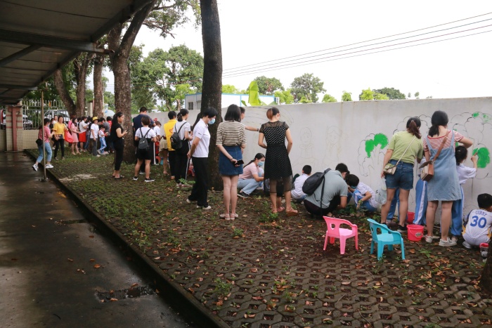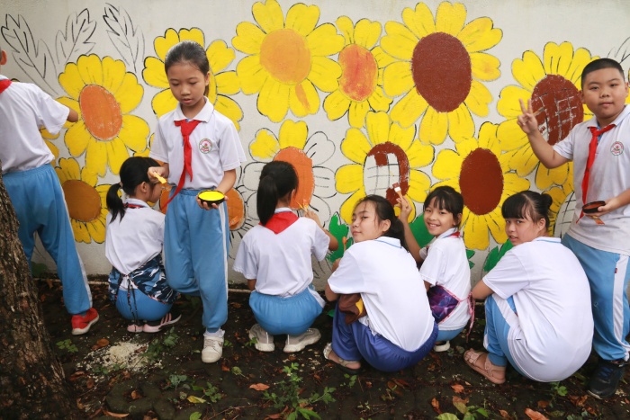 八月第一天雖然陰雨綿綿,但絲毫不影響志愿者們齊動手、共參與的熱情,所有參與本次活動的志愿者都早早地到達了活動地點——光明小學停車場旁的墻壁,大家都迫不及待地想要拿起自己的畫筆進行創(chuàng)作啦!活動開始前,由美術(shù)老師鄧碧興和丁常臻老師在墻壁上勾勒出大概的繪畫輪廓;緊接著就由各個班的班主任分發(fā)繪畫工具,告知本班負責的繪畫區(qū)域以及注意事項,只見孩子們個個都拿起畫筆,一會兒若有所思,一會兒靈機一動,家長們也不甘示弱,也使出渾身解數(shù),一會幫忙遞繪畫工具,一會兒洗畫筆,在大家的合理分工,共同努力之下,原本單調(diào)的墻壁愈發(fā)變得燦爛有趣,你看!一朵朵向日葵正在和大家打招呼呢!一棵棵大樹正努力向陽生長呢!時間過得很快,活動快要接近尾聲,但是大家卻意猶未盡,所有的志愿者努力把自己對文明城市的美好期待通過手中的畫筆呈現(xiàn)出來。