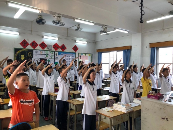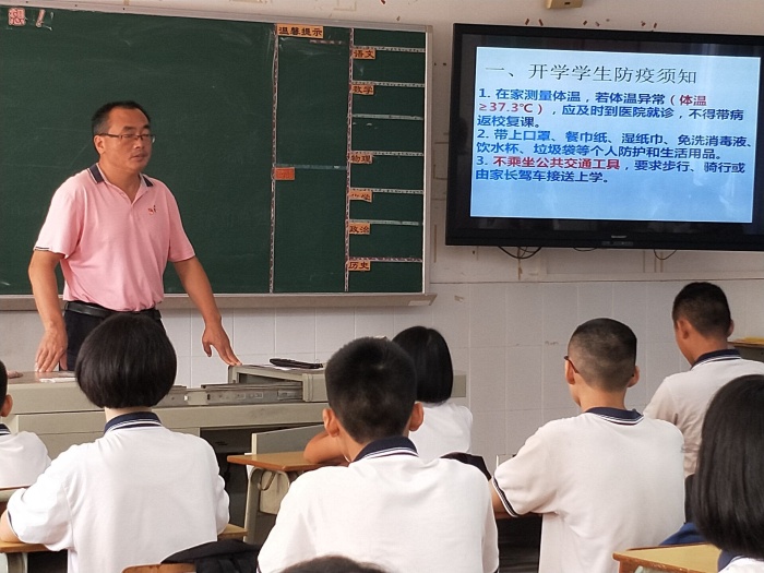 該校德育處張成斌主任發言,他對同學們新學期的學習提出了明確要求:一是要嚴格執行各項常態化疫情防控要求,按各項指引規范學習和生活;二是要消除假期綜合癥,將全部精力轉移到學習上來;三是不要沉迷網絡,遠離手機游戲;四是要養成愛公物、講文明、重安全、愛集體的好習慣,遵規守紀,做一個文明沙中人。各班召開班會《開學第一課》。班主任和同學們一起學習了開學防疫須知、社會主義核心價值觀、《中小學守則》、人人參與創文等內容;還發動學生要和家長一起,觀看當天晚上中央一臺播出的《開學第一課》。