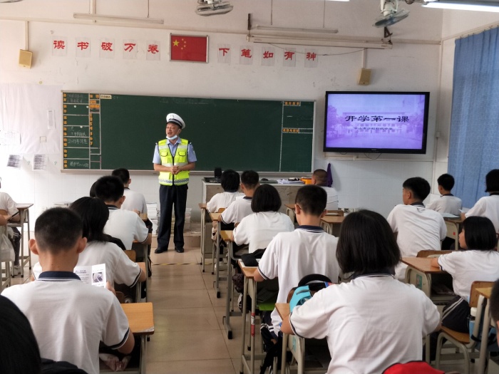 該校校長梁炳華首先發表了熱情洋溢的新學期致辭,他對新加入沙中大家庭的師生表示歡迎,然后從“9.3中國人民抗日戰爭勝利紀念日”說起,為全校師生上了第一堂思想政治課,要求全體師生《牢記歷史,勿忘國恥》。同時要求同學們愛國愛校,弘揚民族優良傳統,志存高遠,努力為理想而拼搏,為國家強大而奮斗。還要求同學樣要“厲行勤儉節約,反對鋪張浪費”,在日常學習和生活中做到勤儉節約。緊接著,法制副校長、沙欄派出所高所長為同學們作法制知識講座。高警官從校園欺凌的案例說起,要求同學們遵規守紀,不忘安全。希望同學們學會自我保護,避免違法犯罪,健康、幸福地成長。