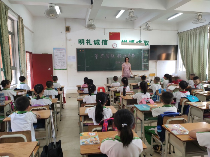 在莊嚴的升旗禮之后,吳校長開始講課。課中,吳校長首先跟大家分享了1945年9月2日日本在投降書上簽字的場景,告誡大家這是中國近代以來反侵略歷史上的第一次全面勝利,也為世界反法西斯戰爭的勝利做出了巨大貢獻。接著跟全校師生一起回顧中國曾經屈辱的歷史,外國侵略者在中國的土地上橫行霸道、肆意妄為犯下了不可磨滅的滔天罪行。最后吳校長回到現在,講到:今年已是抗日戰爭勝利75周年,今天我們生活在和平安定的社會中,但我們不能忘記以前落后就要挨打的局面,忘記了國恥。教育全校孩子們要將國恥銘記在心中,以此為動力奮發圖強學習,更加精益求精,不怕吃苦,肯下苦功,抱著“為中華之據起而讀書”的信念,德智體美勞全面發展,擔負起建設祖國的重任。