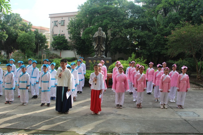 緊接著由六(2)班的學生帶來《弟子規》的誦讀表演。在他們的帶領下,全校學生集體誦讀《弟子規》,朗朗的讀書聲充盈了校園。然后是正衣冠儀式:自正衣冠,互正衣冠,師正衣冠。活動最后,全體師生向孔子像行鞠躬禮,少先隊員代表還在孔子像前為全體教師送上鮮花,向老師們送上節日最真摯的祝福。