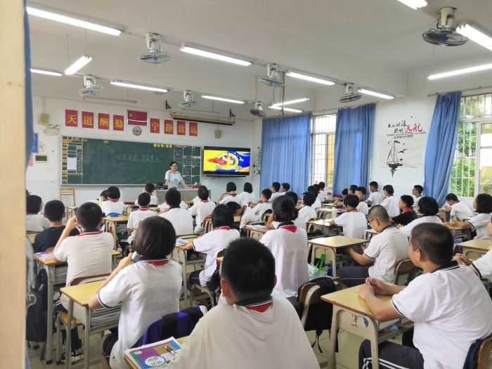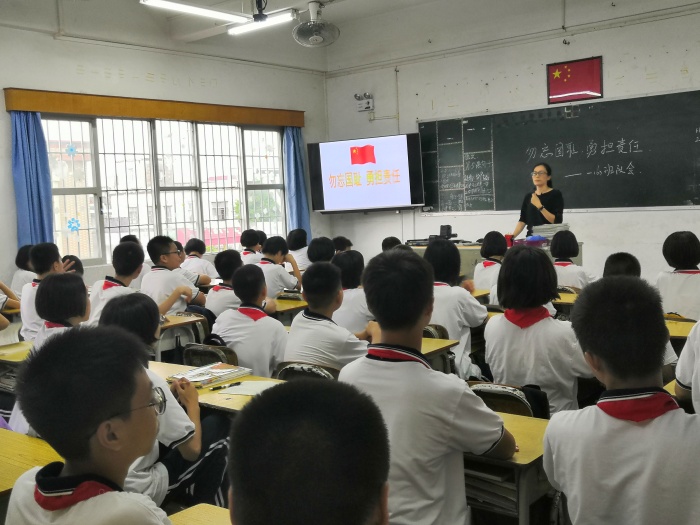 開學第三周星期一,沙欄中學全校開展了“勿忘國恥,振興中華”的主題班會。三個年級的學生在老師的帶領下在嘹亮的國歌聲中進入了主題。