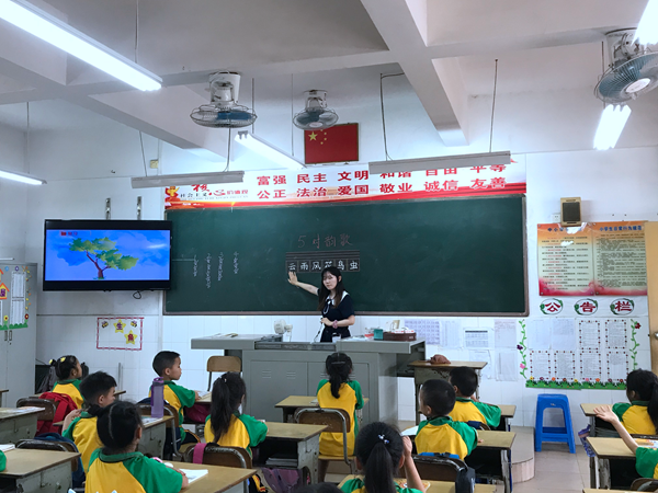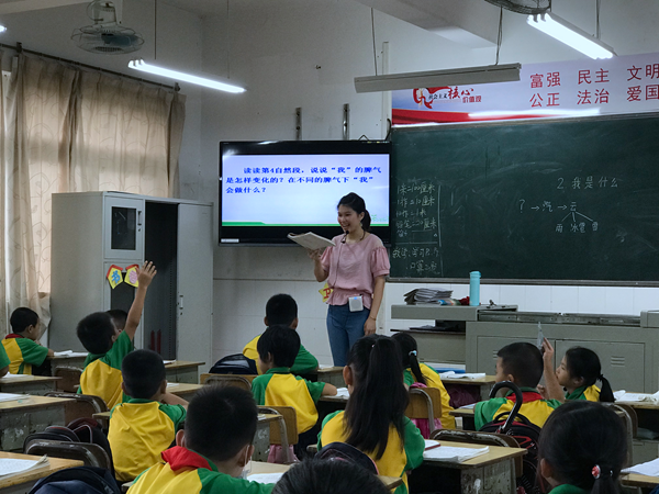 歐陽佩君老師執教一年級《對韻歌》,教學儀態從容,娓娓道來,課堂紀律井然有序,讓學生在輕松的氛圍中識字學文;并采用教師范讀、學生齊讀、小組朗讀等形式,帶領孩子們吟誦古詩,體會漢語的韻律美。