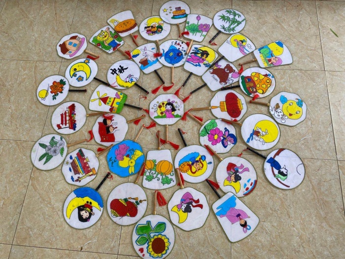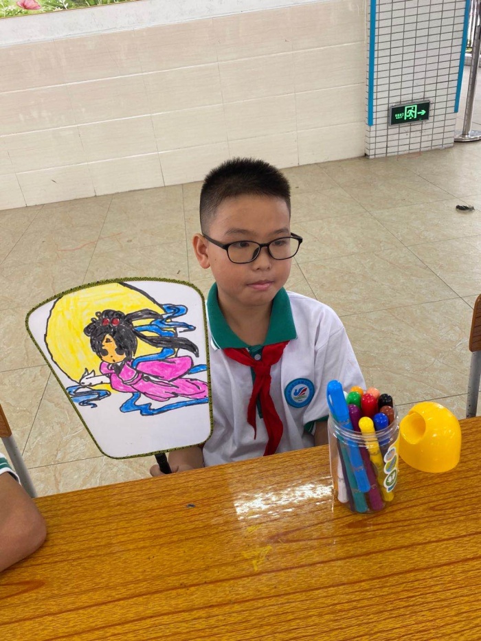 活動開始前,美術老師為每位學生準備了空白的古扇、圓紙盤和種類齊全的繪畫工具,并由吳艮英老師和劉顯眾老師對繪畫的上色技巧和注意事項進行了詳細的講解,接著就是學生們開啟創作之旅。圓紙盤的繪畫形式多樣,有畫植物的,例如竹子、鮮花、樹木等;也有畫動物的,例如鯨魚、蜜蜂、蝴蝶等。古扇的繪畫圍繞雙節為主題,一幅幅栩栩如生的圖畫在學生手中的書畫筆逐漸成型,以繪畫形式共同祝福我們親愛的祖國國泰民安、繁榮昌盛。