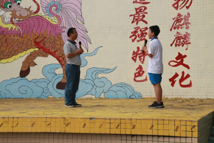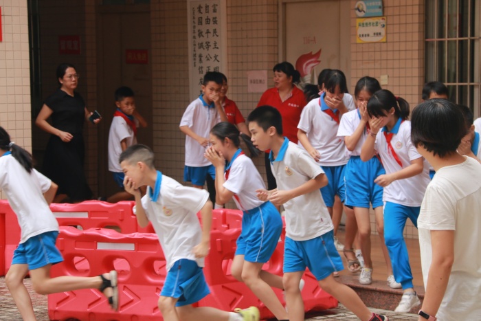 16點,火災警報聲拉響。各班學生在班主任的組織下迅速從課室撤離到走廊,其余老師快速到達指定崗位協助、指揮學生按照指定路線進行撤離。疏散過程中,老師們時刻提醒學生盡量壓低身體,捂住口鼻快速、有序地撤離,到達學校空曠大操場的安全地帶。接著,各班立即清點人數,并迅速上報給演練總指揮王輝副校長,確保每一位學生都安全撤離。