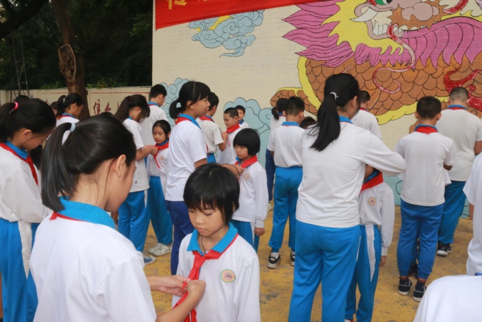 入隊(duì)儀式在莊嚴(yán)肅穆的出旗曲中拉開了帷幕,大隊(duì)旗伴隨著雄壯高昂的旋律飄揚(yáng)。精神抖擻的隊(duì)員們齊唱隊(duì)歌,嘹亮的歌聲響徹運(yùn)動(dòng)場(chǎng)。緊接著,大隊(duì)輔導(dǎo)員廖樂詩(shī)老師宣讀組建二年級(jí)中隊(duì)的決定,并宣布新隊(duì)員名單。新隊(duì)員們滿心期待,靜候六年級(jí)隊(duì)員為之授紅領(lǐng)巾。當(dāng)佩戴上鮮艷的紅領(lǐng)巾時(shí),每位新隊(duì)員都意氣風(fēng)發(fā),喜笑顏開。