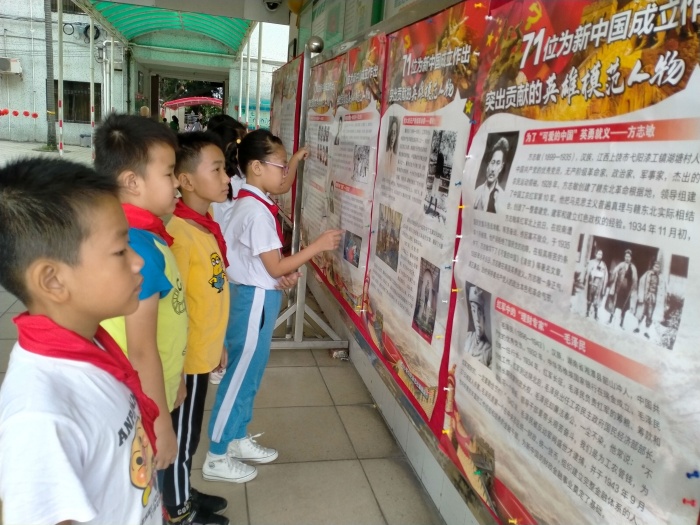 圖文展示。在學校展示欄上張貼了71位為新中國成立作出突出貢獻的英雄模范事跡圖文,讓同學們感受革命先輩意志,陶冶愛國主義情操!