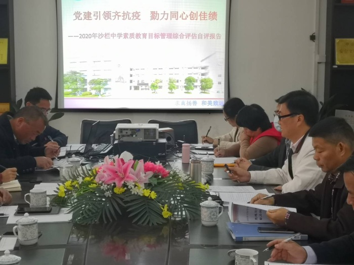 沙欄中學校長梁炳華向檢查組做了《黨建引領齊抗疫 勠力同心創佳績》的素質教育目標管理綜合評估自評報告。梁校長分別對學校發展規劃、課堂教學管理、教師專業發展、德育工作、校園文化建設、課題研究、論文獲獎和發表等詳細地作了報告,將該校各方面工作全方位地向檢查組呈現。