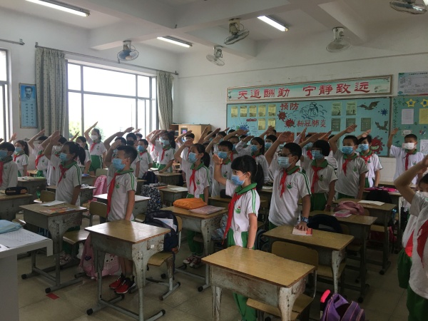 早上8:10,舉行莊嚴的升旗儀式。升旗儀式結束后,三角鎮中心小學周榮純校長做復學第一課國旗下講話,強調疫情防控形勢依然不容放松, 雖然我們不能沖在疫情防控一線,但是我們要和祖國心連心,堅定必勝的信念,體現我們少年兒童的責任感和使命感。