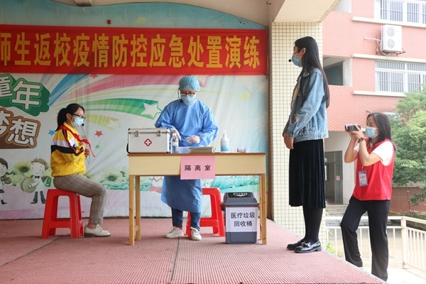 演練按照學生入校、乘坐校車、飯堂就餐、課堂教學等場景對發熱應急處置、消殺消毒等各個場景和環節進行了全方位、全流程、全仿真模擬。