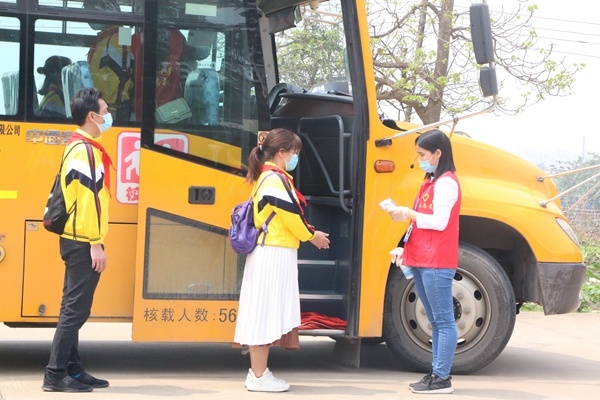 在校車乘車點,學生有序排隊,跟車員對每位學生進行體溫檢測,合格者依次上車并模擬了乘車途中學生身體不適的應急處置。