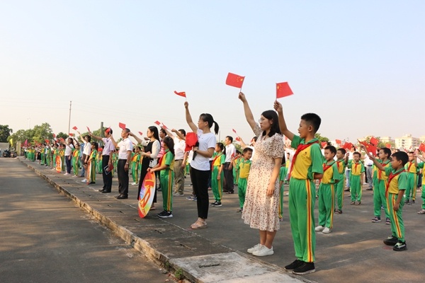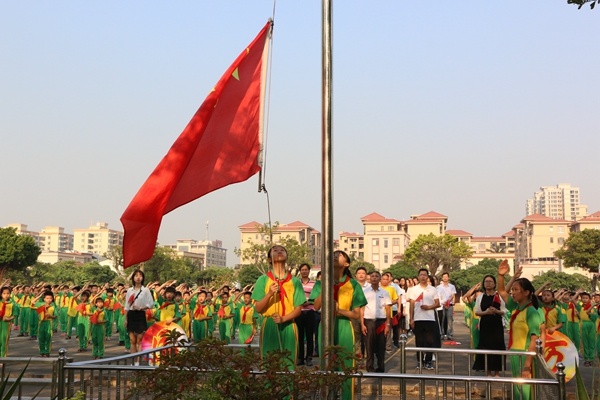 隨后,全體師生懷著無比激動澎湃的心情,高聲齊唱一曲《歌唱祖國》,大家伴著旋律搖動手中的小國旗,深情唱出了對祖國的熱愛與眷戀,唱出了廣大學(xué)子濃濃的中華情。最后,莫校長帶領(lǐng)全體師生懷著真摯而又自豪的心情呼號:“祖國萬歲!祖國萬歲!” 將現(xiàn)場的愛國情感推向高潮。