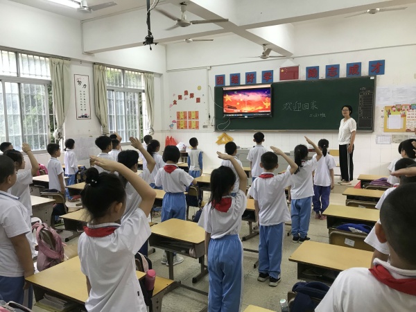 早上8:30分,一至三年級的全體師生在課室里肅立,少先隊員行隊禮,通過電視屏幕進行升旗儀式,唱響國歌。隨后,為了讓全體師生快速適應、融入校園生活,更健康成長,黃滿華校長給大家上了一堂生動的“開學第一課”。黃校長在講話中激勵師生們通過此次新冠肺炎疫情,明白什么是家國情懷,知道什么是真情陪伴,堅信磨難使人成長,更加懂得生命的珍貴。通過以上四個方面,希望全體師生守好每個人的責任,向著“光耀美德,明理修身”的目標前進,共譜光明小學教育新篇章。此外,黃校長還對復課期間注意的事項進行了強調,著力營造一個平穩、有序、安全的校園環境。