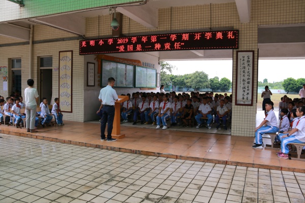 首先舉行了莊嚴的升國旗儀式。在雄壯的國歌聲中,鮮艷的五星紅旗冉冉升起,全體師生注目國旗,心懷崇敬與自豪,也滿懷對新學期的美好期待。升旗儀式后,三角交警大隊梁燕華為全體師生作了交通安全教育,進一步增強了師生的交通安全意識和自我防護意識。接著何景宇老師作了題為《愛國是一種責任》愛國主義專題教育講話,指出熱愛祖國,是我們每個中國人應有情感,也是義不容辭的責任。最后,黃滿華校長發表講話,他希望孩子們做愛黨愛國、心存感恩的學生;做品德高尚、光明磊落的學生;做樂于學習、甘于吃苦的學生;做身心健康、越挫越勇的學生;做明辨是非、追求真美的學生。他寄語全體師生在新學期要努力踐行社會主義核心價值觀,把社會主義核心價值觀內化于心里、外化于行動,做一個“光耀美德 明理修身”的光明人。