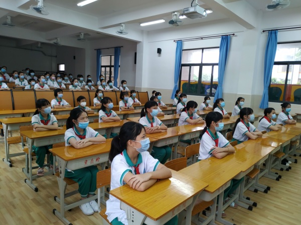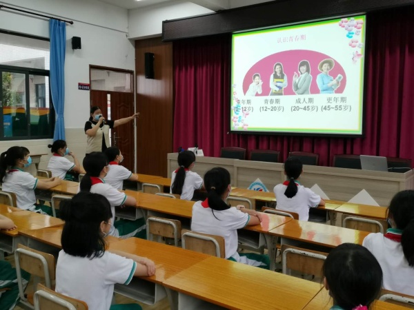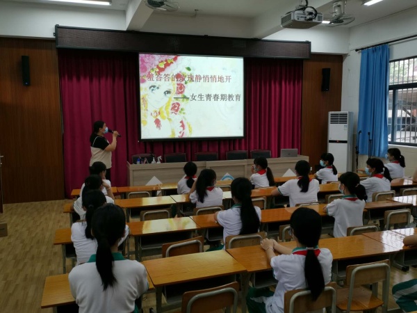 該講座由大隊輔導員杜老師主講,五年級女生均戴上口罩,相隔一個位置參加了專題教育講座。講課過程中,杜老師用幽默生動的語言,深入淺出地告訴同學們什么是青春期,指出青春期女生生理的變化和自我保護措施。接著,杜老師舉了很多同學們平時最關心、也是比較敏感的實例,引導她們學會如何保護自己,愛惜自己,做一個陽光快樂的女生。