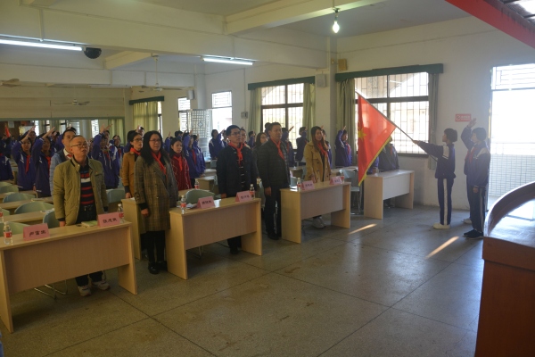 會議在雄壯的國歌聲中拉開帷幕,奏唱國歌后,出中國少年先鋒隊隊旗,奏唱隊歌。三角鎮團委副書記周瓊珠為大會致辭,她表示學校少工委要大膽探索新形勢下少先隊工作,適應社會發展需求的內容和模式,重視和加強少先隊輔導員、少先隊工作者隊伍建設,不斷優化少先隊輔導員工作環境。