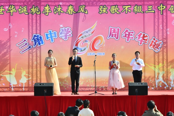 憶往昔,薪火相傳歲月稠;看今朝,繼往開來共繁榮。為展示學校六十年的教育成果,展現(xiàn)當代師生風采,彰顯辦學特色,促進學校發(fā)展。三角中學誠邀關愛學校的何錦波先生、胡石生主任等社會各界人士及家長,師生共1600余人籍校慶之機,歡聚校園,重睹母校芳華,同敘離別友情,共商學校發(fā)展方略,展望三中學校輝煌的未來。12月6日下午三角中學60周年校慶文藝匯演暨獎教獎學在大操場歡樂舉行,大會由覃子湘、胡鳳路老師和黃頤鑫等同學主持。