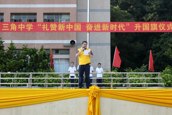 “我愛我的國,我愛我的家。國是我的國,家是我的家……”“祖國萬歲!祖國萬歲!”嘹亮的歌聲,舞動的紅旗,深情的祝福響徹美麗三中的每一個角落。2019年9月30日早上八點整,三角中學全校師生精神昂揚,手持紅旗,整齊列隊,高唱國歌,舉行“禮贊新中國,走進新時代”升旗儀式,慶祝新中國成立70華誕,教辦胡石生主任也到現(xiàn)場參加此次活動。