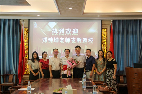 一束鮮花,一張榮譽(yù)證書,一場簡單而不失誠意的歡迎儀式于7月16日在中山市紀(jì)中三鑫雙語學(xué)校行政樓會(huì)議室舉行。這場歡迎儀式的主人公是三鑫小學(xué)部的鄧鐘坤老師。2020年6月9日,按照黨中央國務(wù)院、廣東云南兩省省委省政府的部署安排,為進(jìn)一步鞏固中山市三鄉(xiāng)鎮(zhèn)對(duì)口綏江扶貧協(xié)作工作成果,三鑫學(xué)校發(fā)出綏江支教通知。通知一發(fā)出就收到鄧鐘坤等十幾名老師積極報(bào)名,經(jīng)學(xué)校研究決定,鄧鐘坤作為2020年春季中山東區(qū)組團(tuán)赴綏江支教的一員前往綏江支教。7月15日,鄧?yán)蠋熤Ы虤w來,三鑫校辦副主任賀敏攜鄧?yán)蠋熕谀昙?jí)老師代表前往市區(qū)迎接鄧?yán)蠋煹臍w來,并于7月16日為鄧?yán)蠋熍e辦了簡單的歡迎儀式。