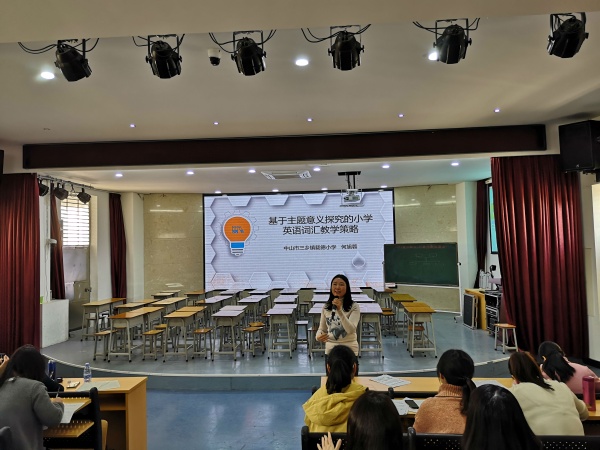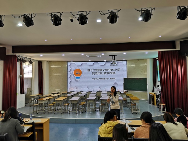 為了讓聽評課更有針對性,第二環節由三鄉鎮小學英語學科研究委員會的何旭蓉主任帶來一場題為《基于主題意義探究的小學英語詞匯教學設計》的講座。首先,何主任在講座前對新銳營的學員進行了問卷調查,圍繞三個問題與青年教師進行互動:您是如何開展詞匯教學的?您是否嘗試過依托語篇開展詞匯教學?如果有,您是運用什么策略進行的?接著,何主任引用普通高中英語課程標準(2017版)和現場老師們進行探討主題意義探究的概念內涵。引用程曉堂教授的話:所有語言學習活動都應該是在一定的主題語境下進行的,有效地向老師們傳遞一個理念:英語教師要具有語篇教學的意識。那怎么依托語篇來開展詞匯教學呢?何主任指出可以從三種渠道進行,分別是自創語篇、改編語篇和使用原版語篇。然后深入剖析載德小學英語科組語篇教學的三個案例成果進一步說明語篇補充的原則、目標、策略,讓現場老師們對如何通過文本補充踐行主題意義探究的詞匯教學有了更深刻的理解。