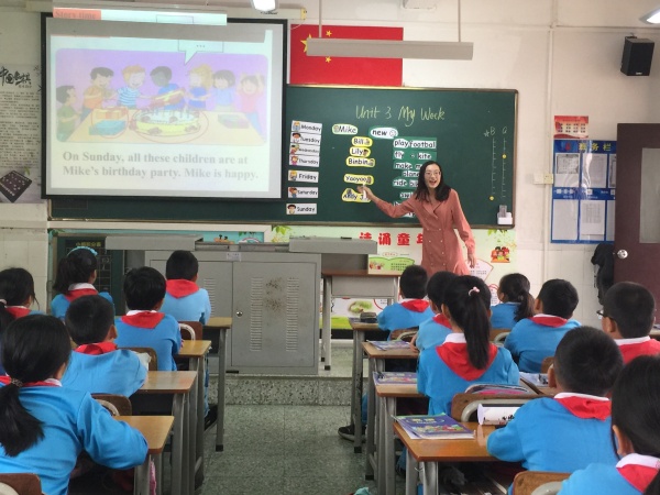 瞧,在第一節(jié)課,由載德小學(xué)駱倩盈老師執(zhí)教的《基于文本補(bǔ)充的故事教學(xué)》課,以四年級上冊Unit3 My Week為例。駱老師以繪本Mike’s Week為主線,創(chuàng)設(shè)問題情境,一步步調(diào)動學(xué)生閱讀興趣,一步步地追問發(fā)展學(xué)生思維。課堂中,駱老師嫻熟地將教學(xué)環(huán)節(jié)自然銜接,使得整個課堂連貫流暢。學(xué)生流利的英語、靈動的英語思維,讓在場的老師們也感受到載德小學(xué)英語學(xué)科基地在培養(yǎng)學(xué)生英語學(xué)科核心素養(yǎng)方面的重視。