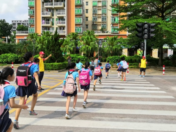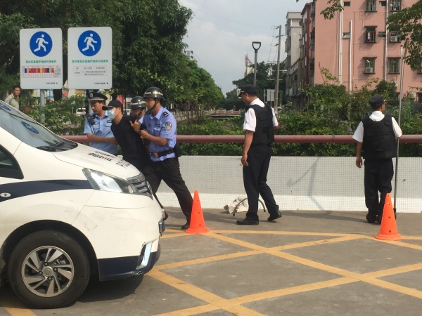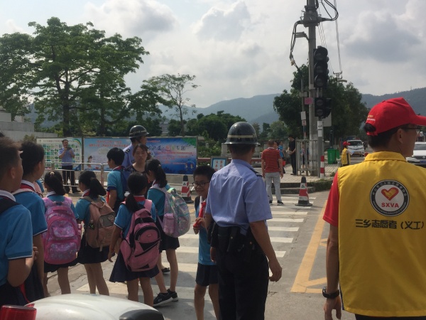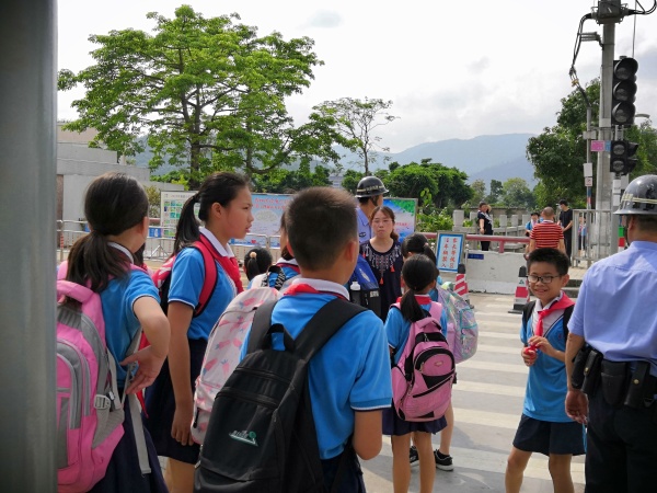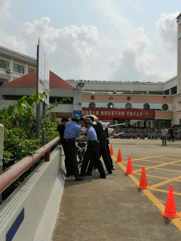 本次演練主要模擬早上7:45左右,在學校大門口,學生在親子義工和老師的護送下,有序地進入學校。突然,一貌似正常路過的晨練男,走在路口橋面中間時以極快的速度斜沖向橋面右側的學生隊伍,同時從懷里掏出一把刀揮動起來,保安立刻上前制止,隨后治安員聞聲而至,與保安一起圍住了歹徒,格頭后將其按倒在地;值日老師、親子義工馬上有序疏散學生。