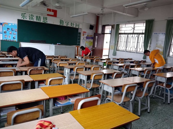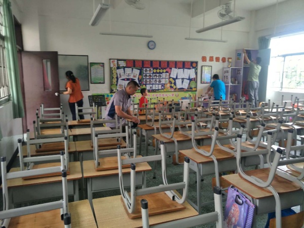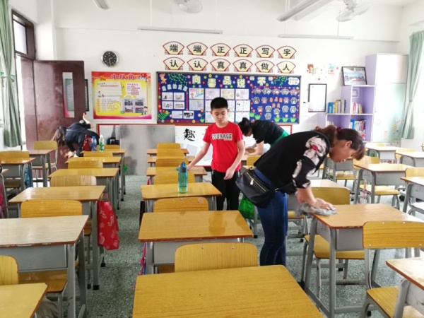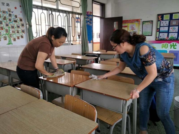 學校利用周末時間,對學校的場地進行了噴藥消毒,各班家長積極響應學校工作,犧牲自己休息時間回校用清水擦拭教室桌椅,抹掉了殘留在桌椅表面的藥物,給學生一個干凈舒適的學習環境。