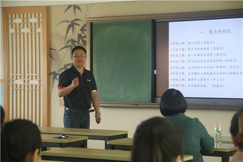 接著由邱運來老師匯報三下習作精品課程開發情況。邱老師匯報了研讀教材時發現統編教材在習作編排上的六大特點:能力序列化、鞏固延續化、編排立體化、題材生活化、指導具體化、要點具體化。邱老師還用精簡的語言對課程開發的每一環節進行解析,并分享八節錄像課的片花。