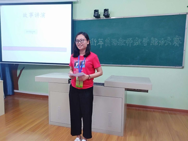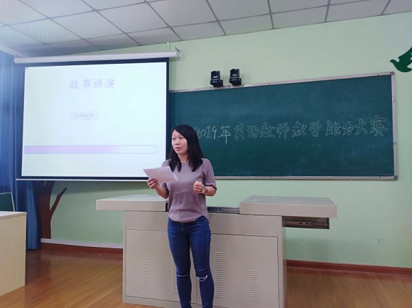 參賽老師齊聚數學教研室抽完簽后,迅速進入公開課室備考理論素養,進行緊張而有序的作答。30分鐘轉瞬間過去。參賽老師緊接著進行講故事比賽。選手抽取比賽故事后單獨準備十分鐘,然后在三分鐘內把故事講給學生聽。每個選手發揮所長,生動形象地把故事講給學生。