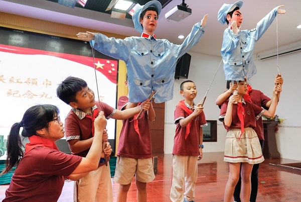 本次活動(dòng)的內(nèi)容主要是以廣府木偶戲?yàn)橹鳎扇l(xiāng)鎮(zhèn)尚古傳統(tǒng)文化中心的六位工作人員操作完成。在木偶戲正式開始前,尚古張華森老師為了提高學(xué)生思想認(rèn)識,提問了兩個(gè)問題。“九一八”事變在哪里發(fā)生的?如果沒有這個(gè)事件日本會(huì)侵略中國嗎?讓隊(duì)員們帶著問題去觀看演出,目的就是讓學(xué)生勿忘國恥,勿忘“落后就要挨打”的歷史教訓(xùn)。