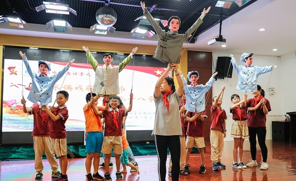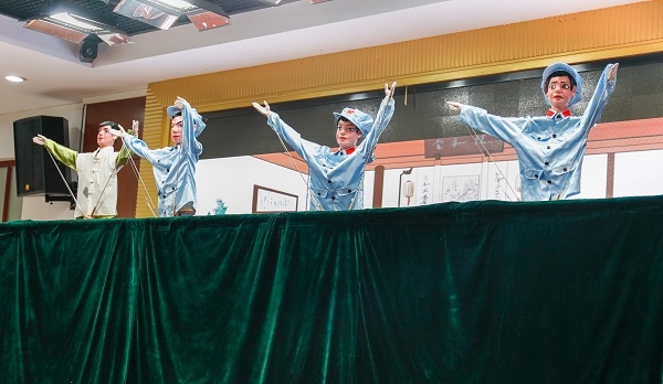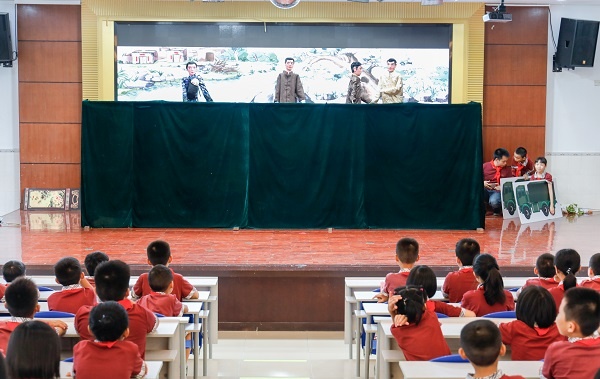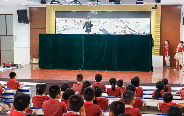 木偶戲演繹的是三鄉(xiāng)鎮(zhèn)抗日時(shí)期的一個(gè)事件《活捉飛天鴨》,工作人員通過木偶戲把隊(duì)員帶回了那段沉重的歷史中,讓學(xué)生們深刻意識到戰(zhàn)爭就發(fā)生在我們身邊。在觀看木偶戲的過程中,學(xué)生那炯炯有神的眼睛、那認(rèn)真聽講的表情、那肩平身正的坐姿無一不說明學(xué)生對這段歷史的重視。