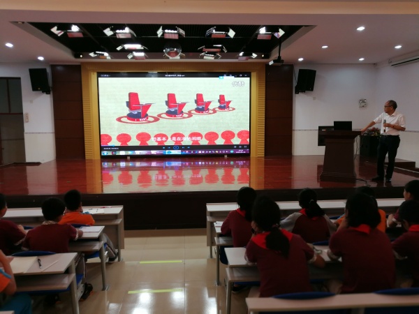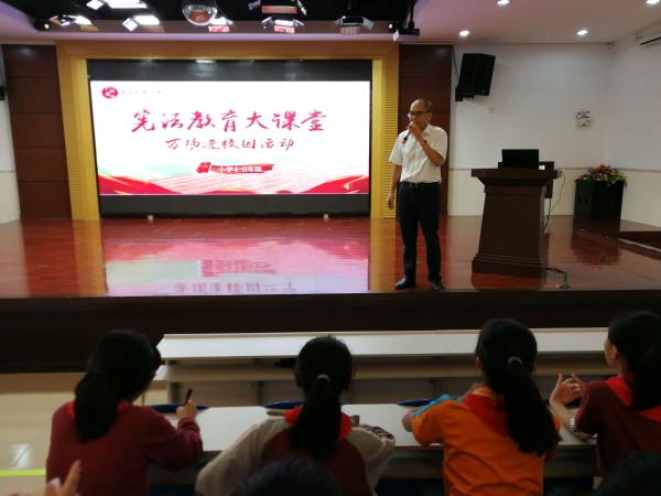 “法安天下,德潤人心”,為深入貫徹學習黨的十九大精神,增強學生的憲法意識,牢固樹立憲法信仰,2019年5月31日下午,新圩小學開展了 “憲法在我心中”大課堂教育活動,六年級全體師生參加了本次學習活動。主講人是香山律師事務所的熊震世律師。