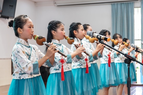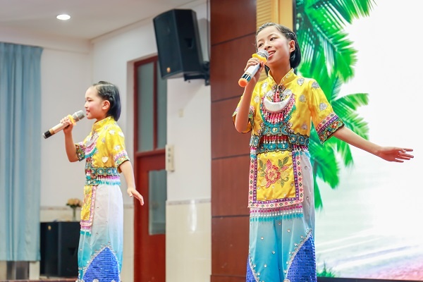 竹笛葫蘆絲齊奏展示了新圩小學(xué)葫蘆絲社團(tuán)建設(shè)的初步成果。這批演員從一年級時開始學(xué)習(xí)吹奏,每周練習(xí)兩個中午,技藝越來越嫻熟。他們的服裝富有民族特色,編排也很用心。